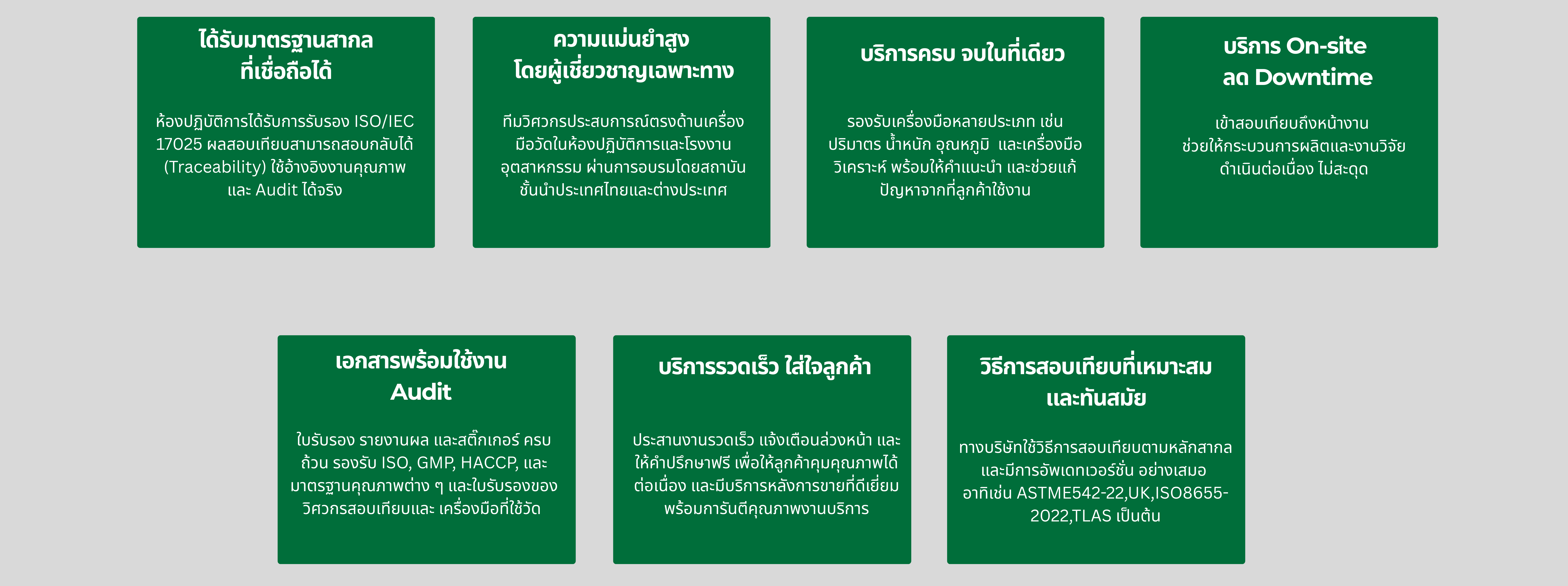 การรับรองนี้ครอบคลุมขอบข่ายสาขาการสอบเทียบ และขีดความสามารถในการสอบเทียบ (Calibration and Measurement Capability: CMC) อย่างเป็นทางการ เพื่อให้ลูกค้ามั่นใจได้ว่าผลการสอบเทียบมีความถูกต้อง โปร่งใส และสามารถสอบกลับได้ตามหลักสากล