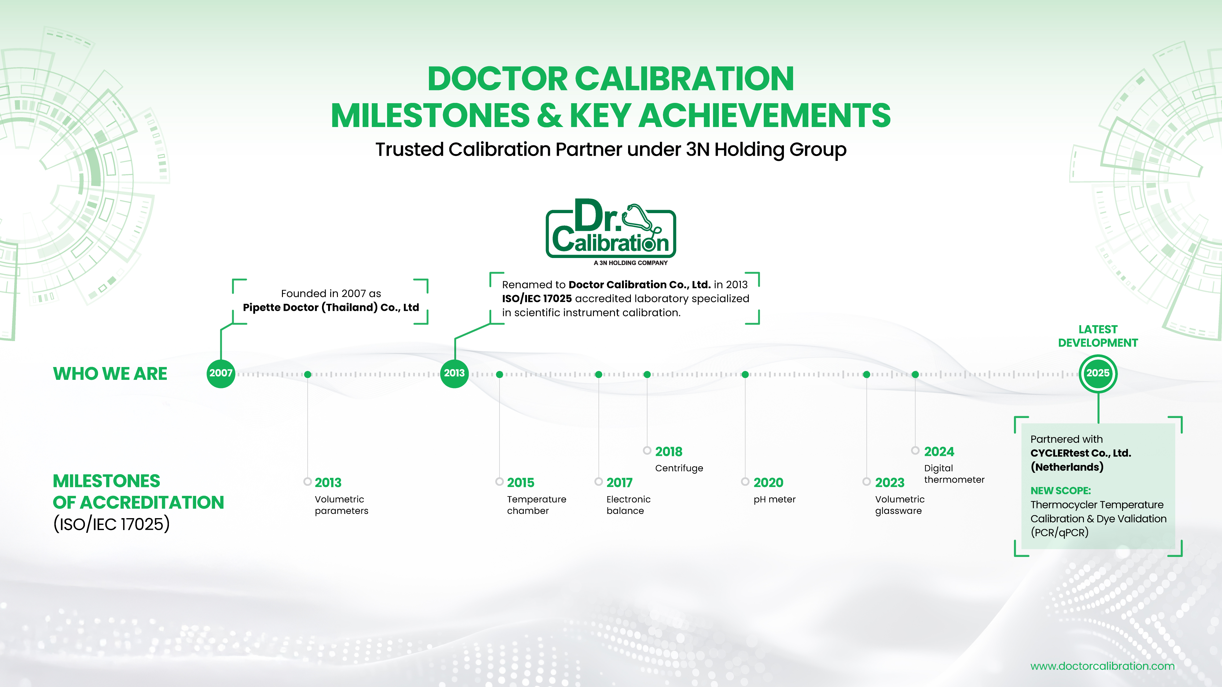 บริษัท ดอกเตอร์ คาลิเบรชั่น จำกัด ได้เปิดให้บริการสอบเทียบในประเทศไทยเมื่อปี พ.ศ. 2550 ภายใต้ชื่อบริษัท ไปเปต ดอกเตอร์ (ประเทศไทย) จำกัด โดยได้รับการรับรองมาตรฐานห้องปฎิบัติการสอบเทียบ ISO/IEC 17025 ของเครื่องมือไมโครไปเปต ขอบข่ายที่ได้รับการรับรอง 0.1 ul. - 10 ml. ห้องปฎิบัติการเป็นห้องที่สมบูรณ์แบบ ทั้งเครื่องมือ อุปกรณ์ที่ทันสมัย ตลอดจนบุคลากรที่มีคุณภาพ มีความรู้และประสบการณ์ พร้อมให้บริการสอบเทียบอย่างเต็มประสิทธิภาพ และบริการหลังการสอบเทียบ รวมทั้งการการันตีคุณภาพงานสอบเทียบ ซึ่งในปัจจุบันเปิดให้บริการสอบเทียบ อาทิ Micropipette, Chamber, Bath, pH Meter และ Spectrophotometer และ ในปี 2556 ได้เปลี่ยนชื่อบริษัท เป็น บริษัท ดอกเตอร์ คาลิเบรชั่น จำกัด